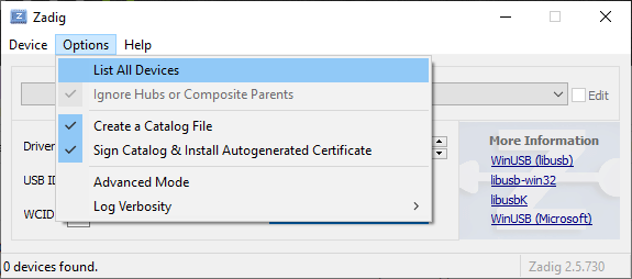 N-Link requires some generic USB drivers, rather than the ones that TI provides. To install them, download Zadig and open it. First, select "Options" at the top and check "List All Devices":