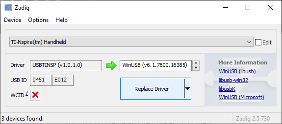 Next, select "TI-Nspire(tm) Handheld" in the dropdown menu, and click "Replace Driver":